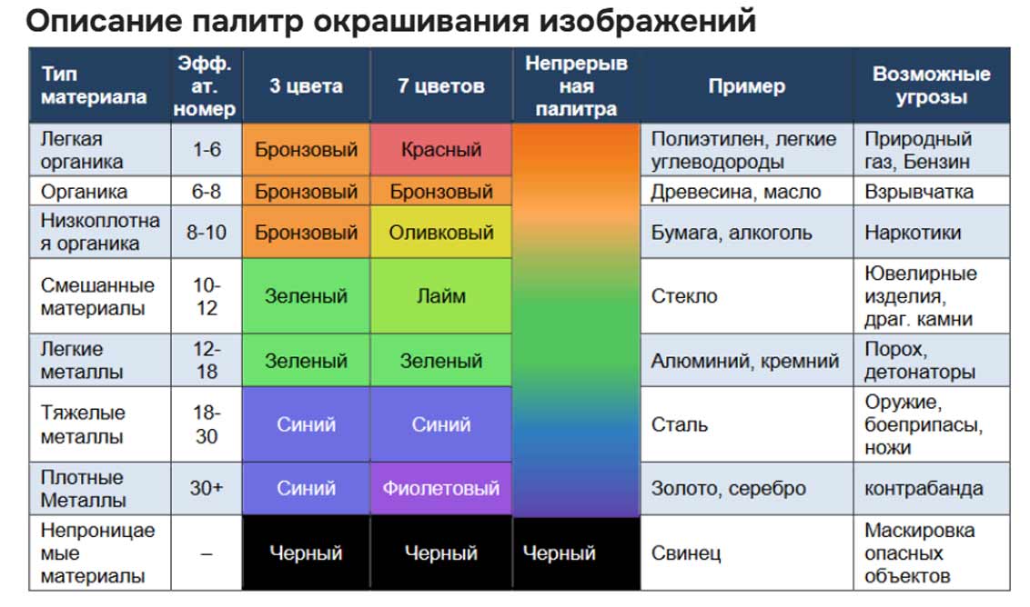 • Поддержка 7-и, 3-х цветной и непрерывной палитр окрашивания изображений. Оператору всегда доступен выбор: использовать привычную 3-х цветную раскладку (органика/неорганика/металлы) или более детальную 7-и цветную, которая позволяет более точно идентифицировать материалы по эффективному атомному номеру. Новые цвета поддерживают внимание оператора и при этом не перегружают его при длительной работе.