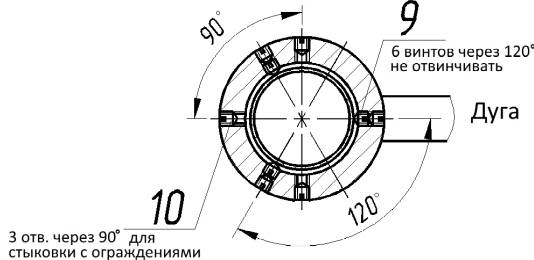 М8х20. Внимание: запрещается использовать для стыковки с ограждениями отверстия поз. 9, винты которых крепят кольца 3.