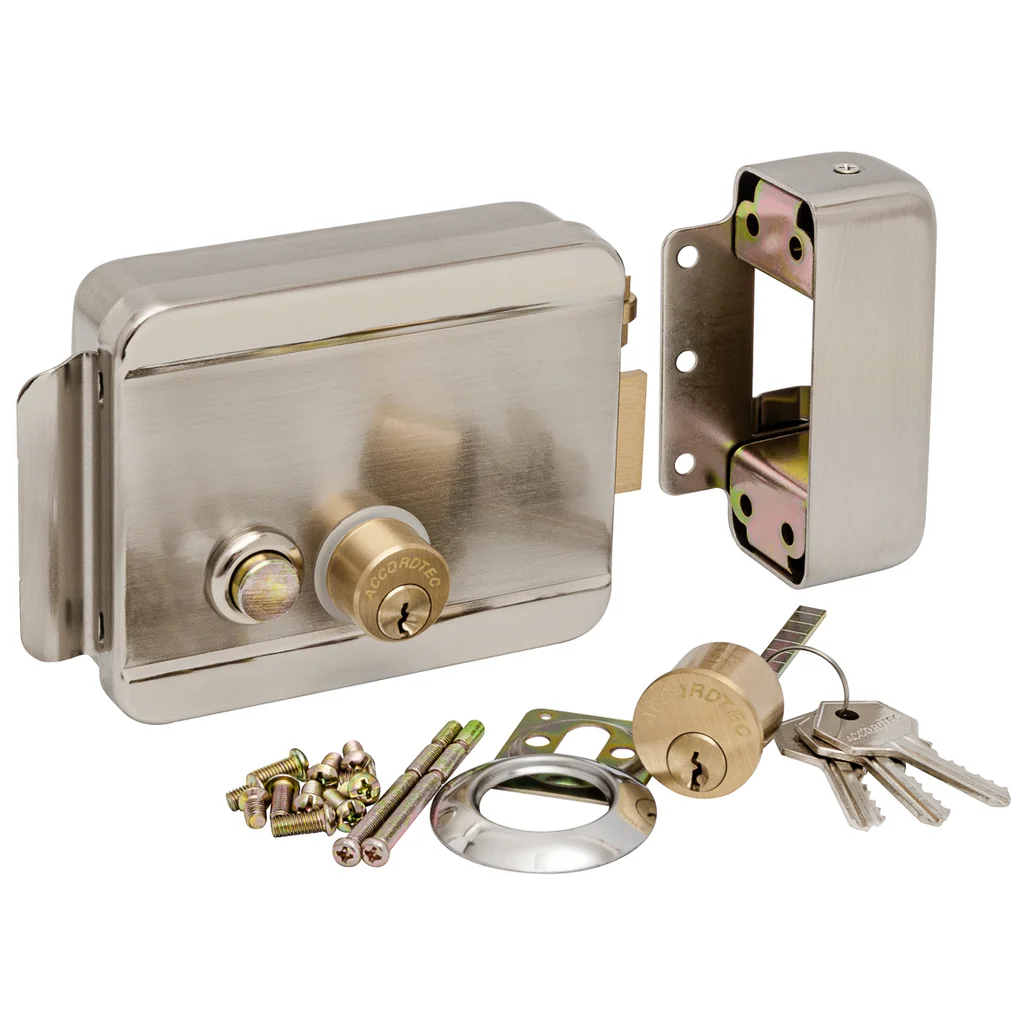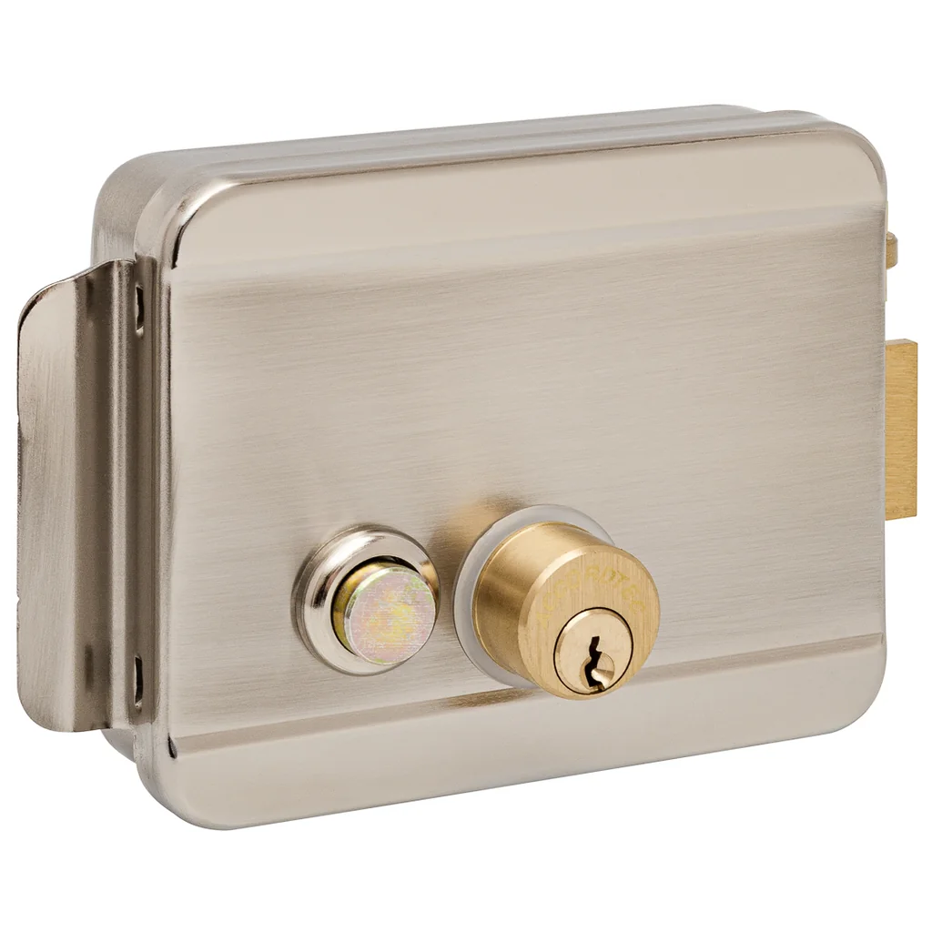 Замок работает от стандартного напряжения питания 12 В и потребляет ток до 3500 мА в импульсном режиме. Он оснащен роликом взвода пружины, обеспечивающим плавную и надежную работу механизма, а также функцией блокировки ключом в закрытом состоянии. Для удобства эксплуатации предусмотрена кнопка выхода, а в комплект входит личинка и пять ключей, что делает использование максимально комфортным и безопасным.