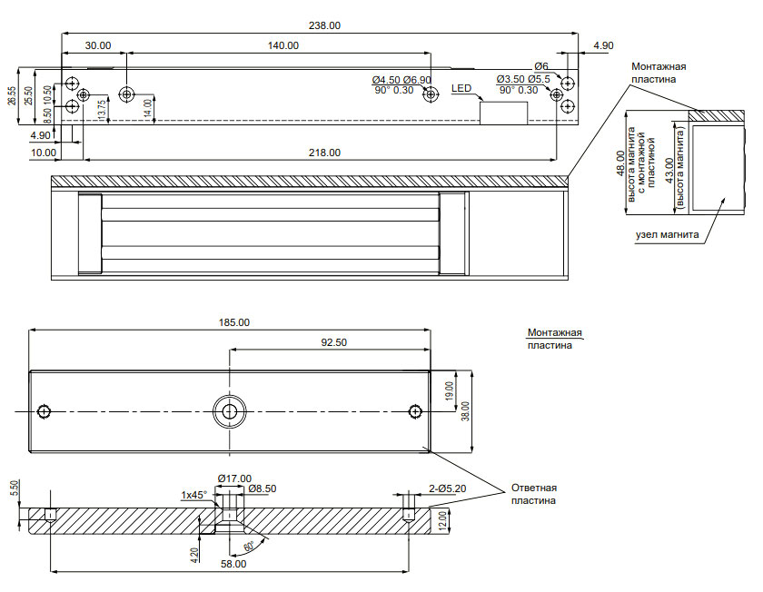 • Размеры корпуса магнита: 238 Д x 48 Ш x 25,5 В мм