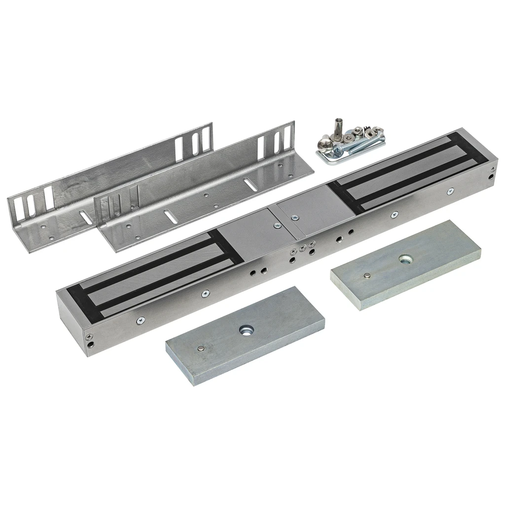 Замок работает от постоянного напряжения 12 В и потребляет ток до 1300 мА. Для компенсации остаточной намагниченности используется специальный механический компенсатор на якоре, что обеспечивает корректное открывание и закрывание дверей. В комплект поставки входят два монтажных уголка, что облегчает процесс установки и обеспечивает дополнительную надежность крепления.