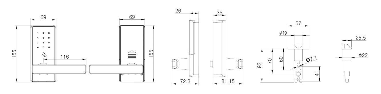- Лицевая часть: 69(W)× 155(L) ×35(D)