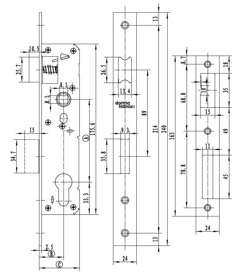 • Замок с торцевой планкой 24 мм для дверей из алюминиевого профиля.