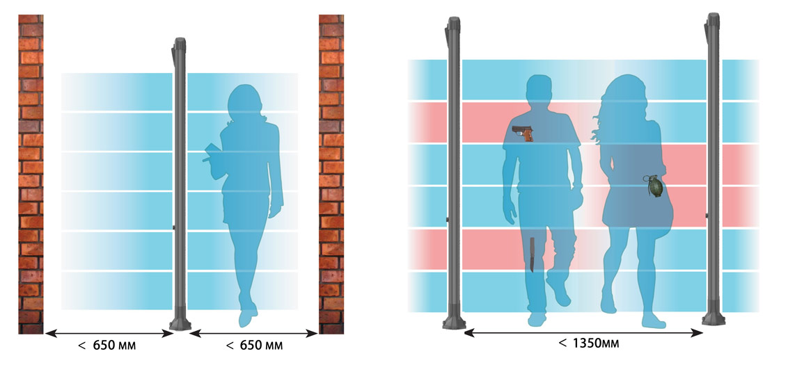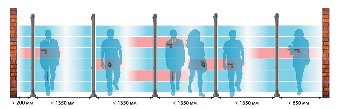 Для более эффективного досмотра на проходных монопанели торговой марки БЛОКПОСТ рекомендуется располагать в один ряд до 6 единиц. При этом расстояние между панелями не должно превышать 1350 мм. Во избежание электромагнитных помех или ложных срабатываний расстояние между неподвижными объектами и металлодетектором должно составлять не менее 70 см, а между подвижными металлическими объектами и панелью – не менее 1,5 м.