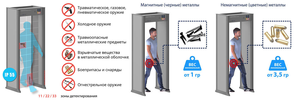 Особенности | Высокочувствительные, С подключением к ПК, С хранением журнала тревог, С сухими контактами, Входные рамки, Досмотровые, Полноростовые, Проходные, Стационарные |