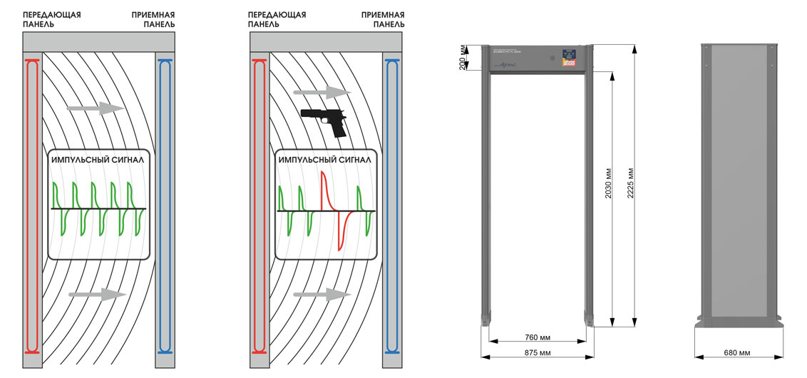 Функционирование металлодетекторов основано на использовании радиоволн. Одна из стенок (антенн) устройства посылает сигнал по направлению к другой стенке, которая этот сигнал принимает и затем возвращает обратно. Как известно, радиоволны через металлические предметы не проходят. При встрече с таким предметом, расположенным на теле человека, проходящего сквозь арочный металлоискатель, одна из радиоволн отражается от него и возвращается обратно быстрее, чем остальные волны. Прибор фиксирует время отражения сигнала и при изменении временного промежутка срабатывает сигнальное устройство. Многозонный металлодетектор имеет возможность точно определить местонахождение одного или нескольких металлических предметов на теле человека, благодаря чему уменьшается время досмотра.
