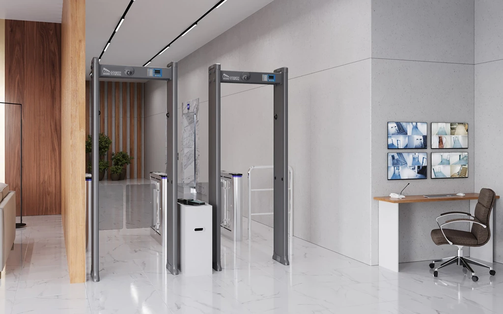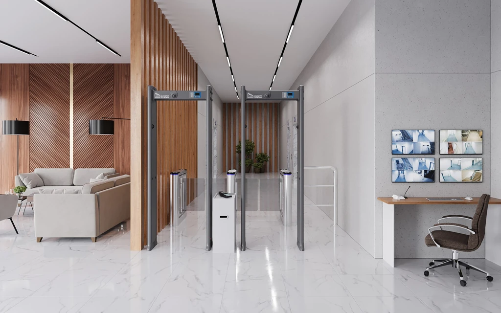 Оптимальное размещение металлодетекторов зависит от условий эксплуатации. Для объектов с высокой проходимостью (аэропорты, вокзалы, массовые мероприятия) рекомендуется установка нескольких проходных зон, разделённых направляющими барьерами. В узких проходах, коридорах и на закрытых территориях металлодетектор можно комбинировать с турникетами или шлюзовыми кабинами. Кроме того, устройства могут быть синхронизированы для работы в связке до 50 конструкций, что позволяет организовать единый проходной комплекс. Минимальное расстояние между металлодетекторами при этом должно составлять от 50 см, чтобы избежать взаимных помех.