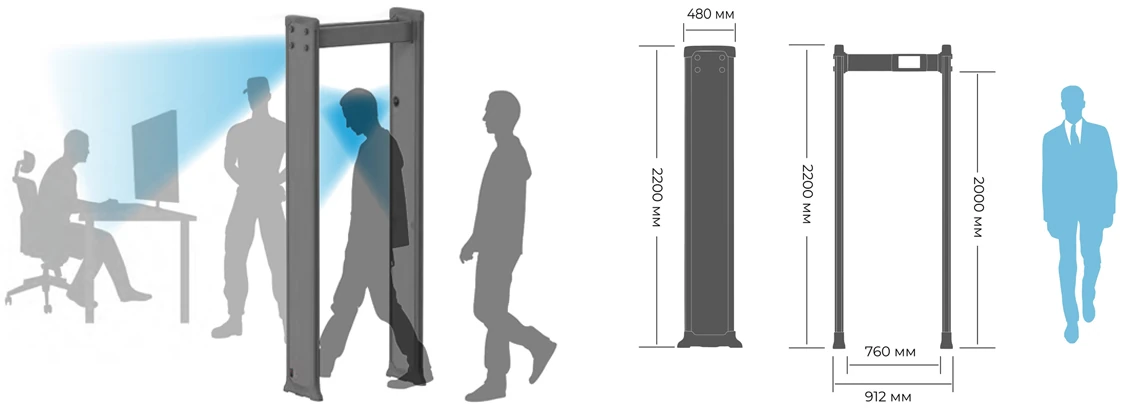 В основе работы металлодетектора лежит много зональная система электромагнитных катушек и цифровая обработка сигналов, обеспечивающая равномерное покрытие зоны контроля без «слепых» участков. Устройство поддерживает конфигурации 6 / 12 / 18 зон, имеет независимую регулировку чувствительности и интеллектуальное программное управление. Камеры, установленные на перекладине и антенных панелях, передают изображение посетителя в трёх проекциях, повышая точность досмотра и снижая количество ложных тревог.