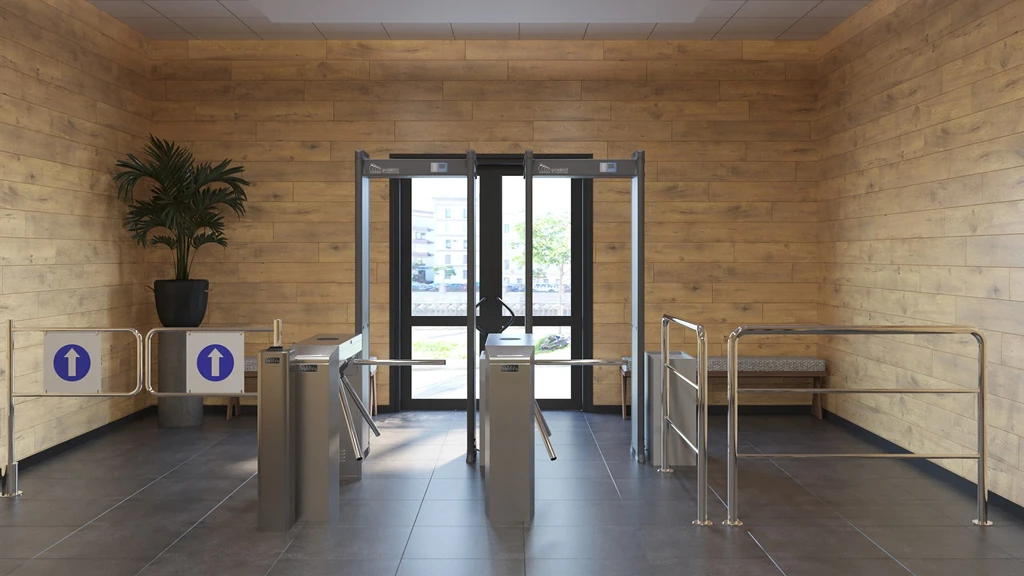 Оптимальное размещение металлодетекторов зависит от условий эксплуатации. Для объектов с высокой проходимостью (аэропорты, вокзалы, массовые мероприятия) рекомендуется установка нескольких проходных зон, разделённых направляющими барьерами. В узких проходах, коридорах и на закрытых территориях металлодетектор можно комбинировать с турникетами или шлюзовыми кабинами. Кроме того, устройства могут быть синхронизированы для работы в связке до 50 конструкций, что позволяет организовать единый проходной комплекс. Минимальное расстояние между металлодетекторами при этом должно составлять от 50 см, чтобы избежать взаимных помех.