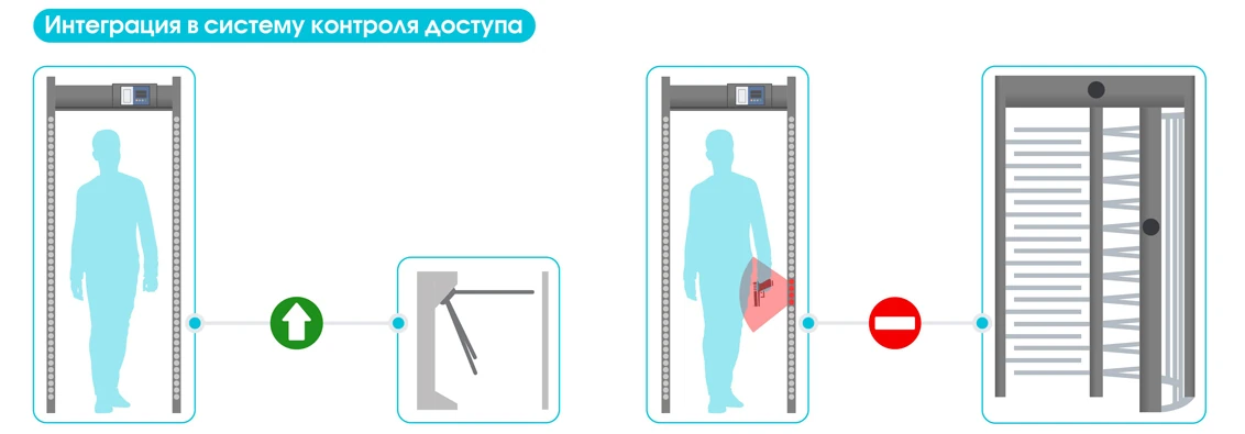 Арочный металлодетектор БЛОКПОСТ "МАТРЁШКА" PC Vx 4800 (48/32/16) может быть интегрирован в автоматизированную систему контроля доступа (СКУД), что позволяет:- Автоматически блокировать турникеты или шлюзовые кабины при срабатывании детектора.