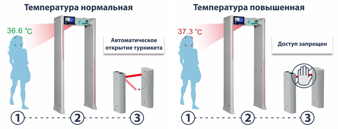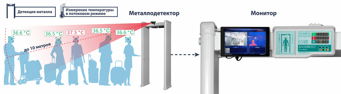 В корпус металлодетектора встроена бинокулярная тепловизионная камера, в ней две видеокамеры инфракрасного и видимого диапазонов, а также модуль термодатчика немедицинского назначения. Прибор измеряет температуру живых объектов (в том числе при недостаточной освещенности), распознает и фиксирует лица посетителей с повышенной температурой тела.