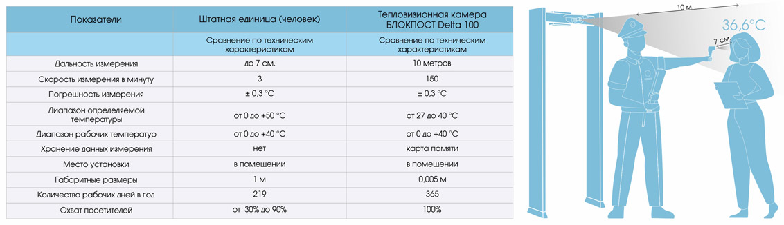 При сравнении основных показателей измерения температуры тела в период пандемии, лидирует тепловизионная камера БЛОКПОСТ Delta 100, она будет рентабельна уже на 4й месяц эксплуатации. Отсутствие человеческого фактора и низкая стоимость с высокой производительностью делают тепловизионную камеру БЛОКПОСТ Delta 100, разумным выбором для любого предприятия, будь то: школа, медицинское/государственное учреждение или крупное производство с высокой проходимостью.