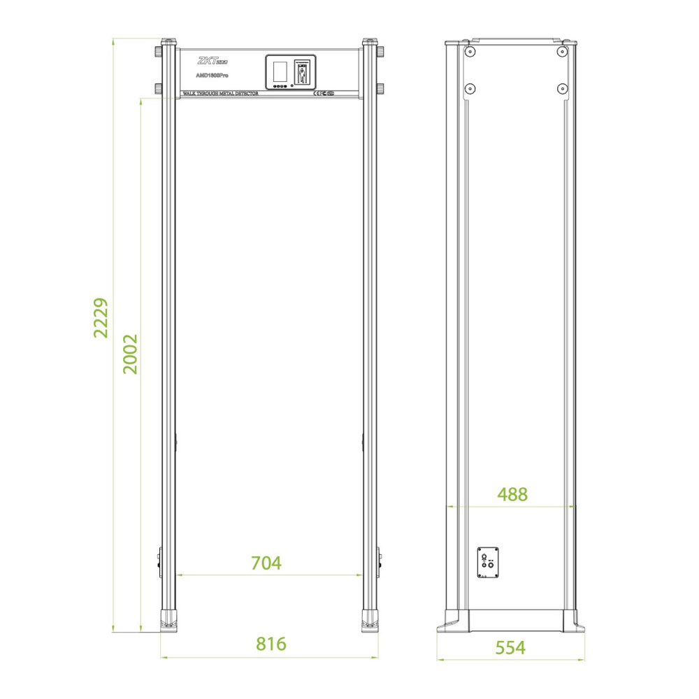 Арочный металлодетектор ZKTeco AMD1800 Pro. 18 зон детектирования, IP65: полная пыленепроницаемость и защита от влаги, звуковой и светодиодный сигнал тревоги, 256 уровней чувствительности, 3,5-дюймовый ЖК-дисплей, TCP/IP-связь, дистанционное управление через приложение WTMD.