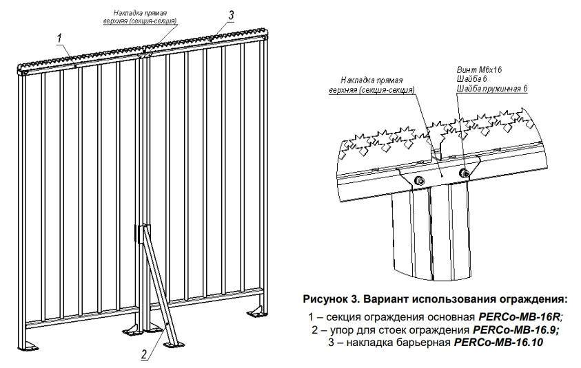 В Руководстве приведены сведения по соединению секций ограждения между собой с помощью соответствующих накладок. Другие типы соединений секций с турникетом (или его крышей), с калиткой, или со стеной и необходимые для этого соединительные деталей, их количество, а также порядок установки не рассматриваются. Эти сведения указываются в монтажной документации на конкретный комплексный заказ оборудования.