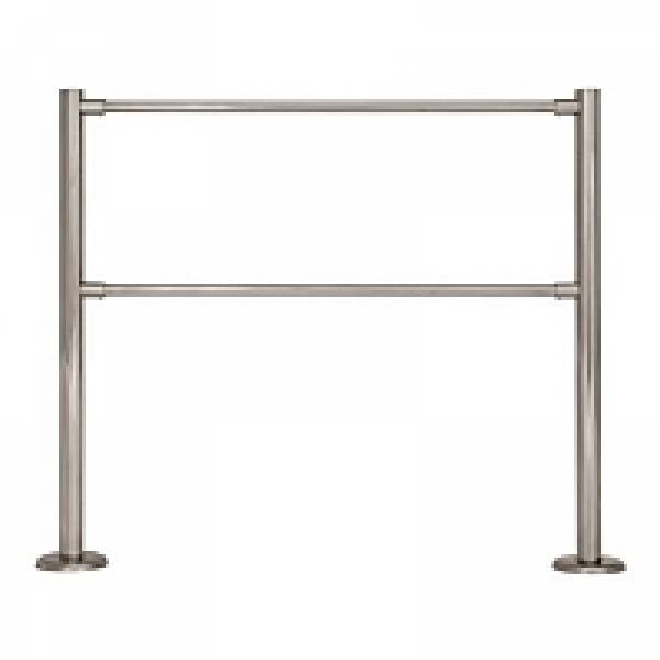 Типовое стационарное ограждение состоит из двух стальных стоек с унифицированными крепежными узлами (муфтами) и двух горизонтальных перемычек диаметром 32 мм (верхней и нижней).