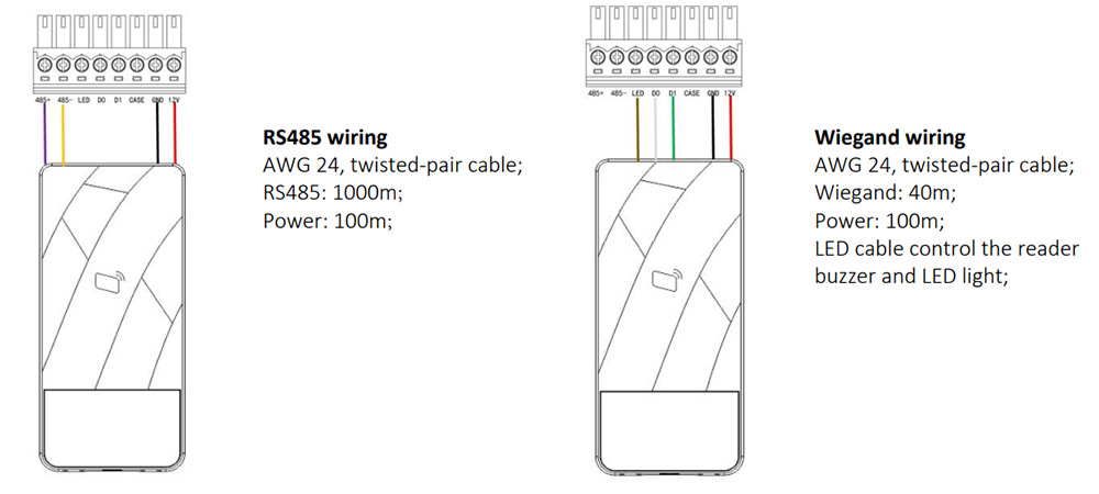 Любой контроллер доступа Dahua может подключиться к считывателю через Wiegand или RS485.