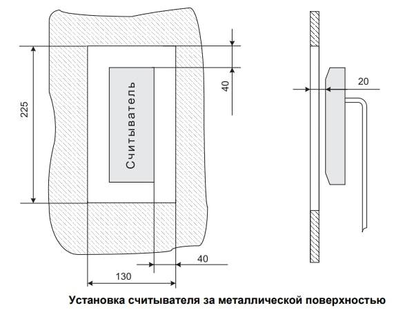 • При установке считывателя за металлической поверхностью, в ней необходимо вырезать окно, напротив которого, равноудалено от краев окна, и устанавливается считыватель, при этом размеры окна должны быть не менее 225×130 мм. Само окно может быть закрыто неметаллической вставкой (например, из пластмассы), а считыватель может быть утоплен вглубь окна на расстояние не более 20 мм от внешней стороны металлической поверхности – дальность считывания кода при таком способе монтажа считывателя уменьшается на 30 – 50%.