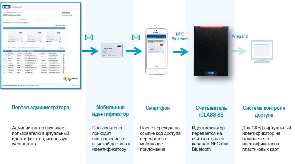 HID Mobile Access – это комплексное решение, позволяющее организовать удобный и безопасный доступ по смартфонам. Для доступа по смартфону могут использоваться привычные считыватели iCLASS SE с модулем активации мобильного доступа. Более того, через один и тот же считыватель пользователи могут проходить и по картам, и по смартфонам.