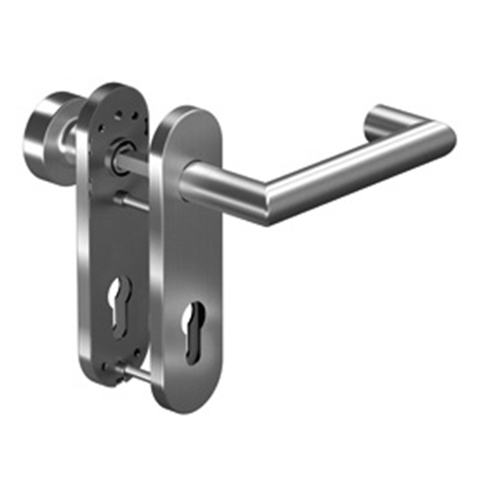 Стальная монтажная пластина ручки помогает надёжно передать даже очень большую нагрузку на дверную створку, защищая конструкцию ручки и замка.