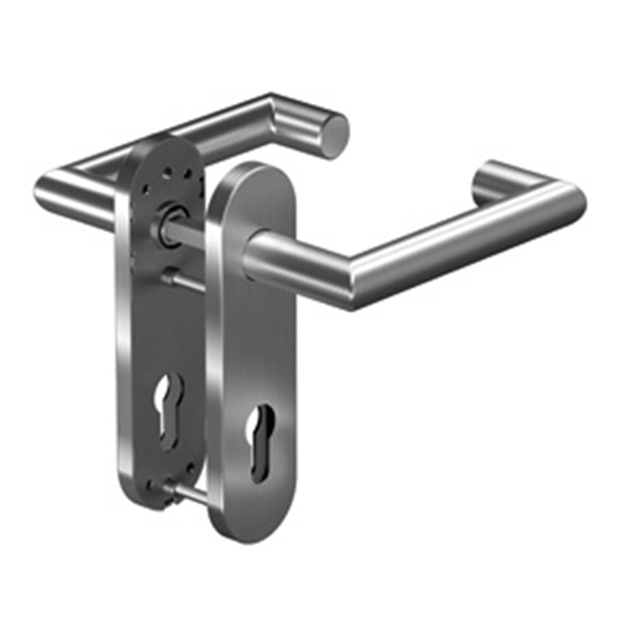 Стальная монтажная пластина ручки помогает надёжно передать даже очень большую нагрузку на дверную створку, защищая конструкцию ручки и замка.