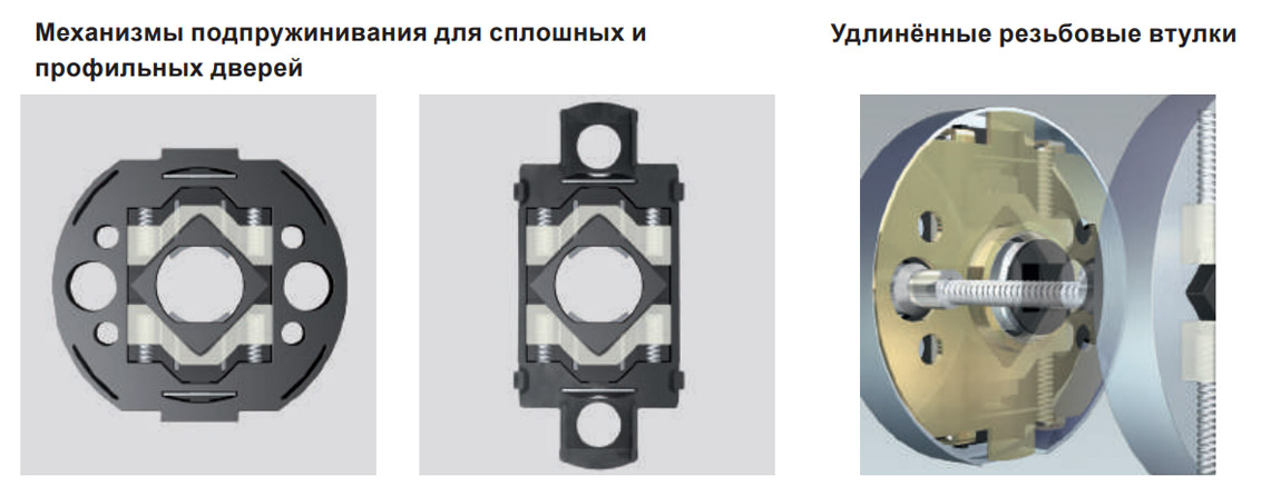 Механизмы подпружинивания симметричны и допускают как левостороннюю, так и правостороннюю установку, что позволяет избежать ошибок при монтаже.