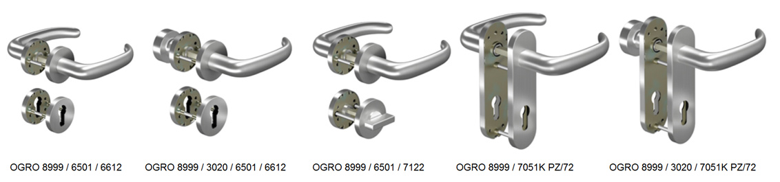 Основной комплект фурнитуры состоит из нажимной ручки с розеткой/накладкой, накладок на цилиндр и шпинделя квадратного сечения, которые могут гибко комбинироваться в различных сочетаниях.