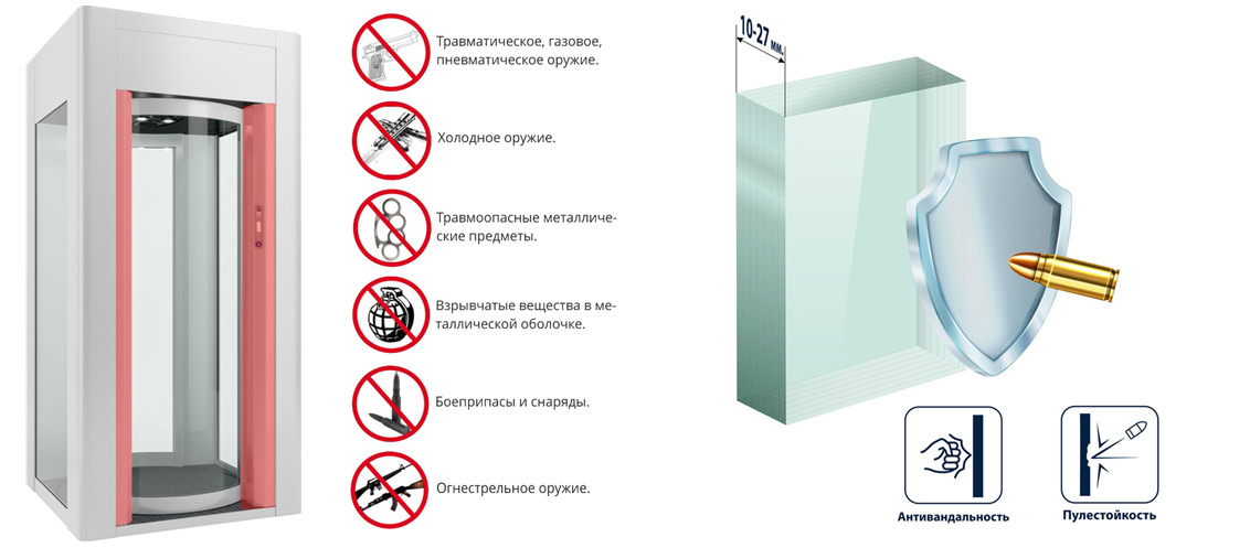 Боковые стенки и раздвижная дверь: Ударопрочные и пуленепробиваемые боковые панели, стеклянные двери, многослойное стекло 27 мм.