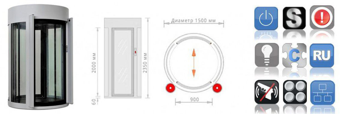 Поддерживаемые функции | Сборно-разборная версия, Контроль наличия человека, Контроль прохода по одному, Контроль пространства прохода, Контроль оставленных предметов, Металлодетектор, Антипаника, Механическая блокировка, Реверсивный проход, Переговорное устройство, Видеокамера, Биометрические устройства, Считыватели RFID карт, Алкотестер, Картоприемник, Тепловизор, Электронное бюро пропусков, Радиационный монитор, Рентгенотелевизионная установка (интроскоп) |