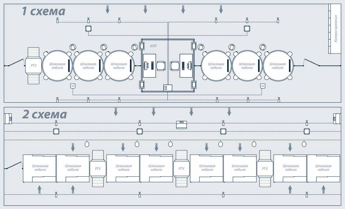 Для усиления контроля доступа на территорию, рекомендуем установить шлюзовые кабины согласно схемам. В зависимости от потребностей, схемы расстановки отличаются наличием дополнительного оборудования и контрольно пропускного пункта.