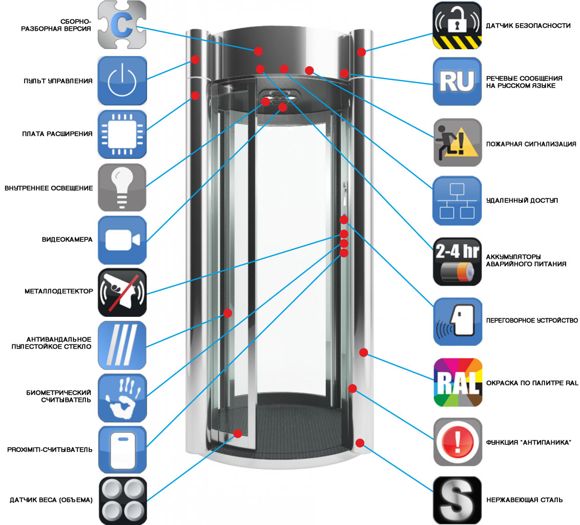 Датчики весовой платформы и объемные датчики расположены внутри кабины и позволяют определить присутствие человека или других предметов в кабине.