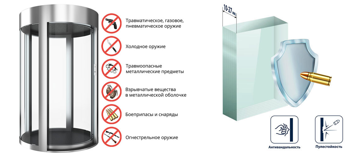 Поддерживаемые функции | Контроль наличия человека, Контроль прохода по одному, Контроль пространства прохода, Контроль оставленных предметов, Металлодетектор, Антипаника, Механическая блокировка, Переговорное устройство, Видеокамера, Биометрические устройства, Считыватели RFID карт, Алкотестер, Картоприемник, Тепловизор, Электронное бюро пропусков, Радиационный монитор, Рентгенотелевизионная установка (интроскоп) |