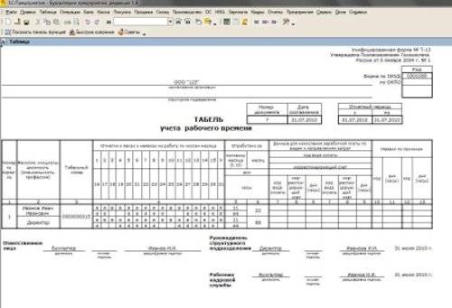 - Существует документ «ТабельУчетаРабочегоВремениОрганизации», он содержит параметры «ПериодРегистрации», «ДатаНачалаПериода», «ДатаОкончанияПериода», «СпособВводаДанных», «СпособУказанияПериода», «Организация», строку «ОтработанноеВремя» с параметрами «Сотрудник», «ПервыйВидВремени», «ПервыйЧасов»