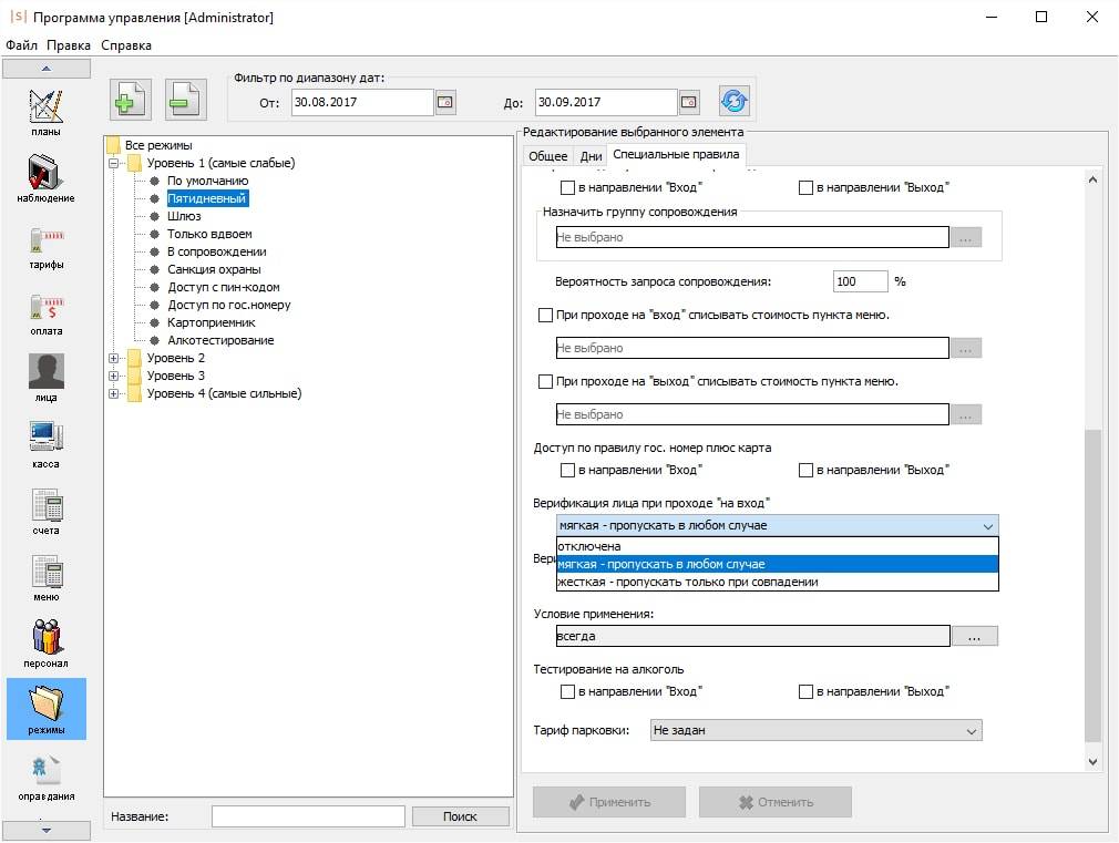 • Свободное место на жёстком диске: 300 Мб для инсталляции системы, плюс место под базу данных. Размер БД зависит от количества сотрудников, размера их фотографий и времени работы системы, т.к. со временем накапливается информация о событиях системы, новых режимах доступа и т.д. Ориентировочный объем, занимаемый данными на жёстком диске – 120 Мб на 1 000 000 произошедших событий.