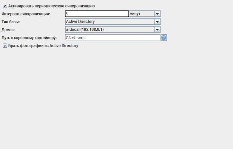 Для работы синхронизации по «Active Directory» в СКУД «Sigur» вводятся параметры соединения с контроллером домена (адрес, название домена, имя пользователя и пароль для подключения).