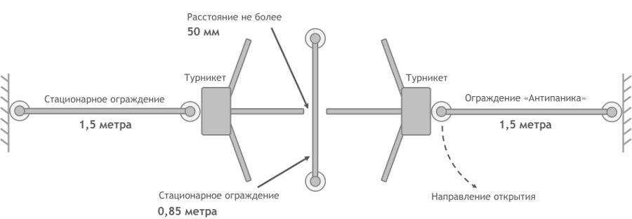 При установке классических ограждений «антипаника» (с пружинными или резьбовыми замками) их открывание производится вручную. Время открытия пружинного замка - порядка 3 секунд, резьбового - порядка 10 секунд.