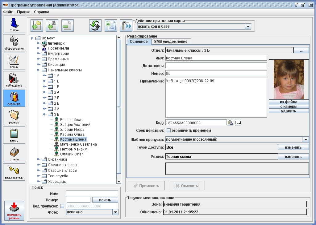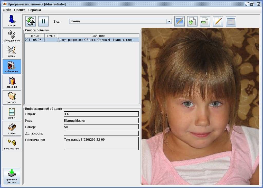 Программное обеспечение системы позволяет легко создавать и редактировать списки учащихся и персонала, а так же задавать ограничения прохода по точкам доступа, присваивания режимов и так далее.