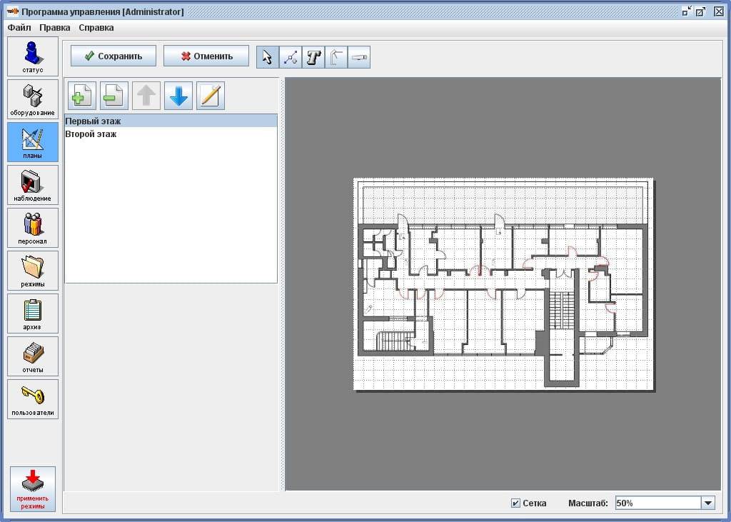 Для наглядности отслеживания событий в реальном времени, а также просмотра видео с точек доступа и их оперативного управления возможно создания планов помещений и указания расположения на них точек доступа и видеокамер.