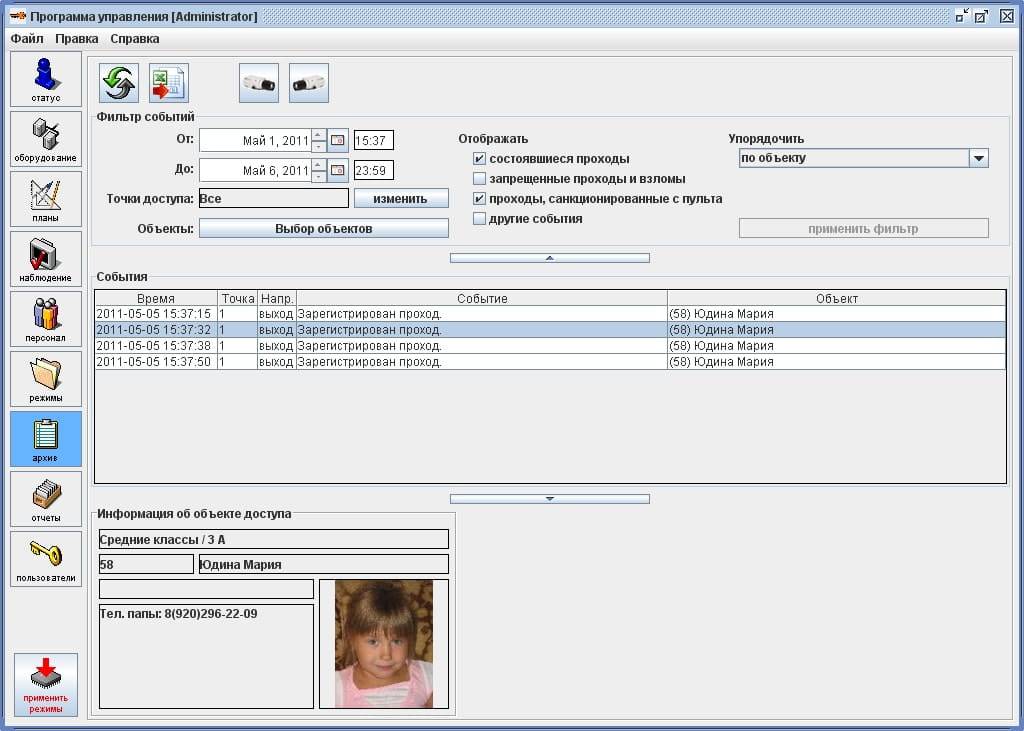 Архив событий предназначен для оперативного получения информации о произошедших в системе событиях с заданным временным периодом, точками доступа и персоналом.