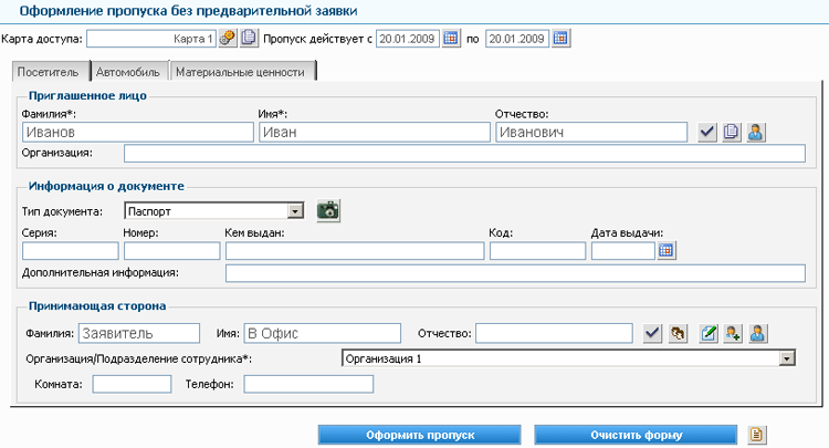Основной задачей системы VisitorControl является регистрация посетителей (гостей) и выдача им разового пропуска на основании предварительной заявки от принимающего лица, или без нее. В процессе регистрации система позволяет внести общие данные о посетителе, сохранить и автоматически распознать скан-копию его документа, сфотографировать лицо.
