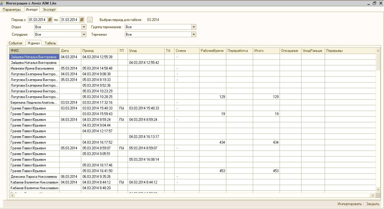 На основании полученного списка событий с учетом использованных фильтров модуль интеграции Anviz – 1С строит отчет с построчным отображением отработанных интервалов, которые рассчитываются с учетом перерывов, отмеченными сотрудниками в течение дня. Журнал рабочего времени также отражает – интервалы времени между приходами и уходами, считающиеся рабочим временем, сумму интервалов за день, опоздание, уходы раньше.