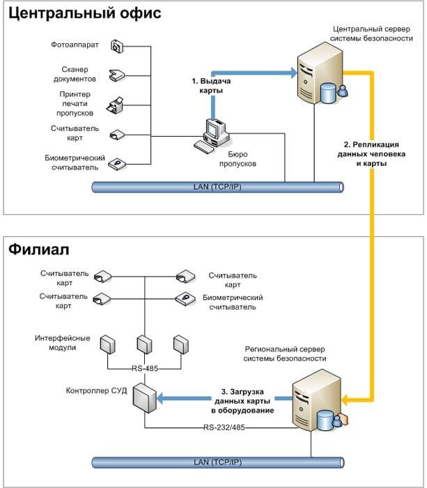 За счет синхронизации данных модуль многофилиальности обеспечивает возможность централизованной выдачи карт сотрудникам организации. Так, в центральном офисе могут выдаваться карты для прохода в любой удаленный филиал системы.