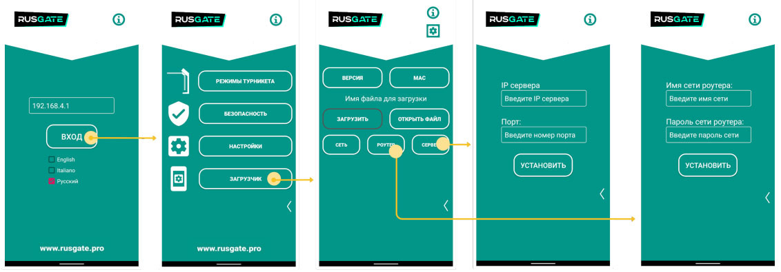 9. Используя Android устройство с ранее установленным приложением Мастеркард, подключаемся к каждому турникету по WiFi напрямую и прописываем в меню Роутер -> SSID и пароль Роутера, а в меню Сервер -> IP сервера (статический IP серверного Android устройства) и Порт 1035.