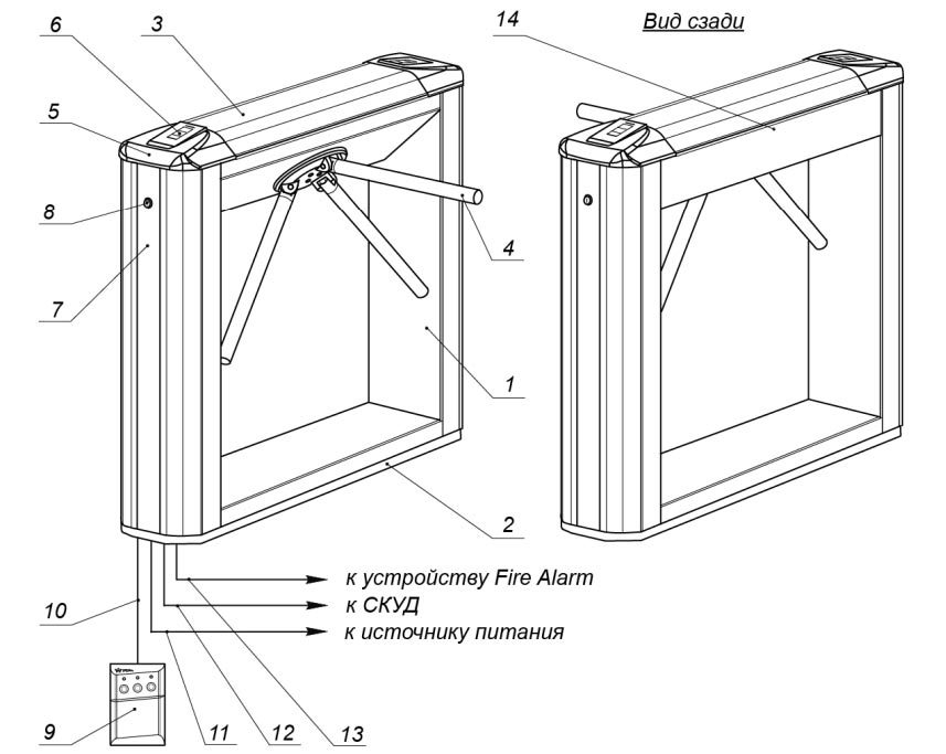 1 – каркас; 2 – основание; 3 – крышка; позиции 1-3 образуют стойку; 4 –планка преграждающая, 5 – крышка торцевая со считывателем; 6 – блок индикации; 7 – боковая заглушка; 8 – замок заглушки; 9 – ПДУ; 10 – кабель ПДУ; 11 – кабель питания1 ;12 – кабель подключения к СКУД1 , 13 – кабель подключения устройства аварийного открытия прохода Fire Alarm1 ; 14 – установочный винт, фиксирующий крышку