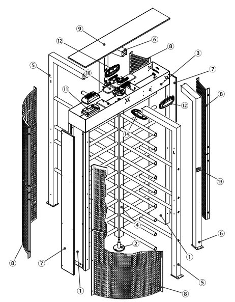 Турникет состоит из двух боковых решеток безопасности, опорных стоек и поперечного короба. Стойки и поперечный короб имеют съемные крышки для проводки кабелей, установки блока управления и/или дополнительных электронных устройств. Центральная вращающаяся часть изготовлена из стали AISI 304 и разделена на 4 секции стержнями-планками из глянцевой стали (Ø 40 мм). Решетки безопасности изготовлены из перфорированных листов AISI 304.