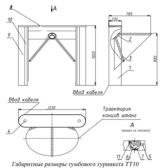 В турникете предусмотрены отверстия для ввода кабеля: с тыльной стороны турникета и в основании – для случая, когда провода от турникета проходят под полом. Электроника турникета по умолчанию расположена в правой стойке 5 (если смотреть спереди со стороны штанг). По заказу возможно расположение электроники в левой стойке.