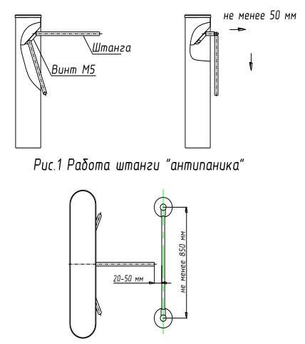 Для правильной работы турникета необходимо установить его с ограждением прохода так, как показано на рис. (вид сверху). Вместо ограждения прохода может быть стена, при этом конец штанги должен быть на расстоянии 20-50мм от стены.