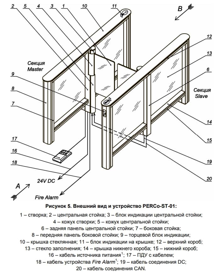 Турникет состоит из двух секций, Master и Slave, а также пульта дистанционного управления. На каждой секции установлена поворотная створка (1), приводимая в движение электроприводом. Секция Slave подключается к секции Master с помощью двух соединительных кабелей (19, 20).