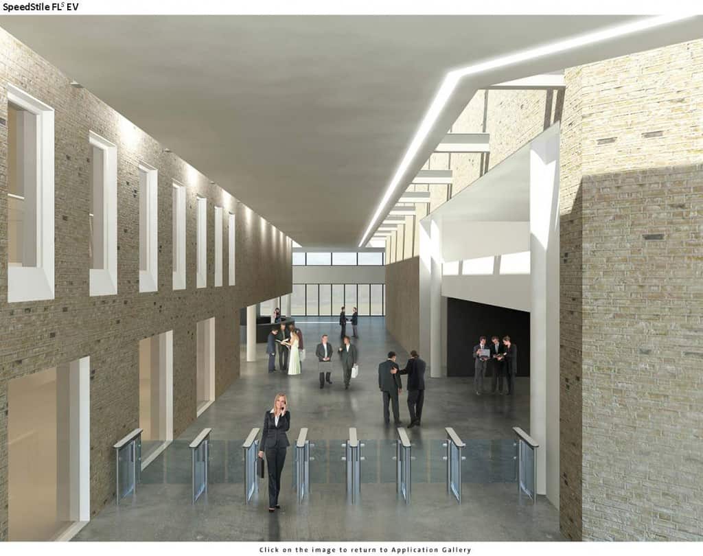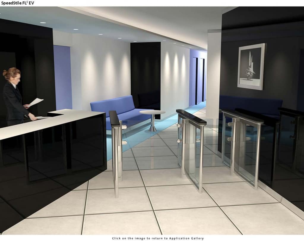 Турникеты с распашными створками SpeedStile FLS отличаются корпусом шириной 12 см с центральной секцией из 10 мм закаленного стекла.
