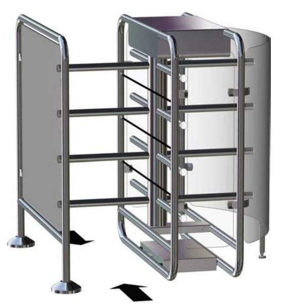 Турникет прост в обслуживании и гарантирует высокую степень безопасности за счет того, что блок управления и роторный двигатель расположены в верхней части турникета. По всем характеристикам эта модель значительно превосходит аналогичные турникеты с ротором в нижней части.