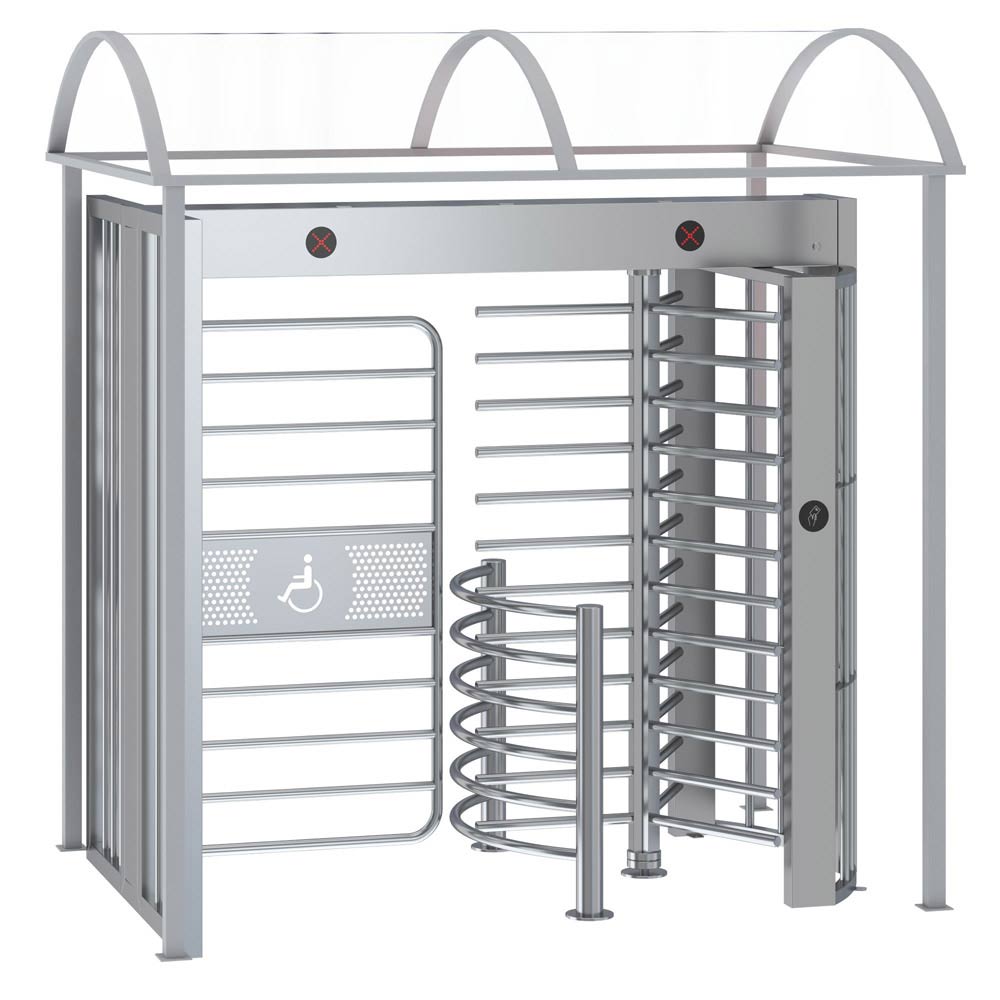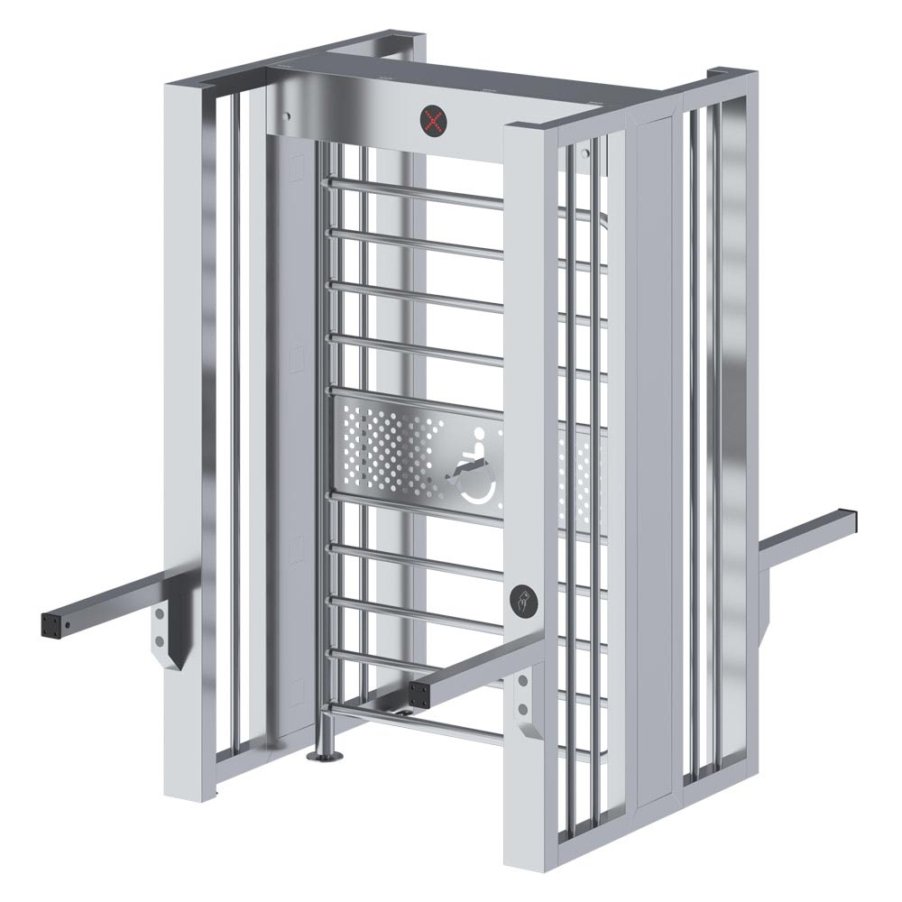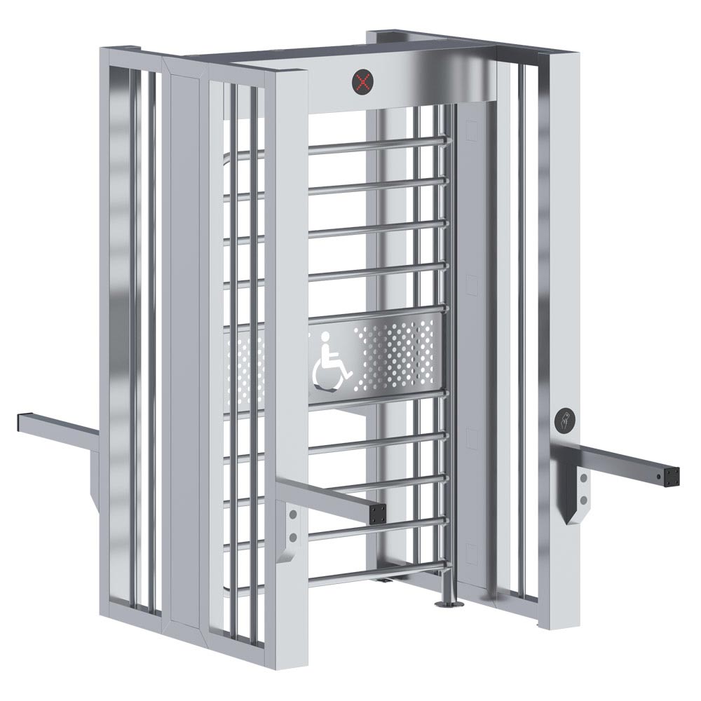 Полноростовый турникет с единой калиткой используется для контроля и ограничения доступа посетителей (в том числе с колясками, велосипедами, и людей с ограниченными возможностями) на объект. Обеспечивает поочередно вход и выход. Основная секция предусматривает только проезд инвалидов, людей с колясками и велосипедистов. Устанавливается как самостоятельным блоком, так и составе модульного заграждения из нескольких турникетов.